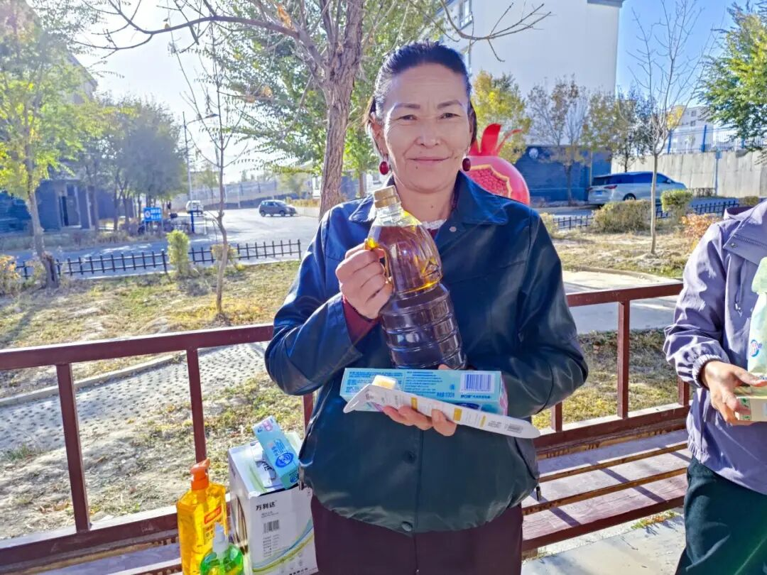 兑换现场更是一派热闹温馨的景象。托河家园的活动点内,居民们手持积分记录本,脸上满是期待,在工作人员的引导下有序排队、核对积分、挑选商品。牛奶、清油、洗衣液等生活必需品整齐陈列,每一件都贴合居民日常需求。“之前跟着社区一起打扫楼道、听健康讲座,随手攒下的积分,没想到今天能换这么实用的东西!这桶食用油够家里用一阵子了,还有牙膏也是日常必备,工作队想得太周到了!”居民古丽加玛丽一手拎着兑换的食用油,一手拿着牙膏,笑容满面地向社区干部分享喜悦,言语间满是对活动的认可,“以后社区有活动,我肯定第一个报名,既帮了社区,还能得实惠,多好!”