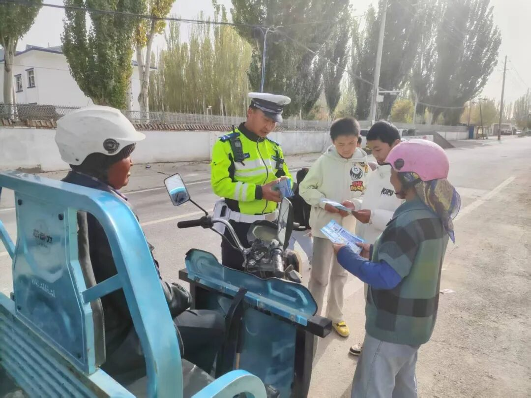 当天,阿合奇县公安局交警大队民辅警深入辖区乡镇道路、路口,针对电动三轮车、摩托车骑乘人员及青少年群体开展“面对面”交通安全宣传。在一处路边检查点,交警一边向骑乘人员发放《农村交通安全须知》,一边结合本地近期案例,讲解不戴头盔、违法载人等行为的危害;遇到放学途中的学生,民警还特意用“拉家常”的方式,提醒他们过马路要“一停二看三通过”,并叮嘱“回家要当‘小宣传员’,告诉爸妈骑车上路要守规矩。”