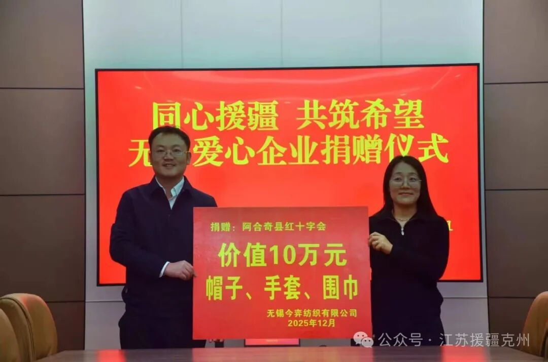 近日,在无锡前方工作组的牵线协调下,无锡吉优环保科技有限公司、无锡市左西电子商务科技有限公司、无锡今奕纺织有限公司三家爱心企业携手向阿合奇县捐赠了一批价值二十万元的御寒物资和五万元爱心资金,以务实举措为边疆群众送去冬日温暖,续写锡奇两地十八载对口支援佳话。