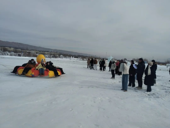 团队项目的登场,更是将整场运动会的气氛推向了高潮。“冰上拔河争霸赛”中,各参赛队伍由10人组成,男女各半,队员们紧握长绳、脚蹬冰面,身体后倾、齐心协力,口号声、加油声、呐喊声,再加上鞋子与冰雪摩擦的“咯吱”声,交织成一首激昂奋进的冬日交响曲,每一次绳索的轻微移动,都牵动着全场人员的心;“拉滑圈接力赛”兼顾速度与趣味,队员们轮流坐在滑圈上,由同伴在冰面上奋力拉动前进,这项运动既考验拉车者的力量与节奏,也考验坐车者的平衡能力,唯有默契配合、协同发力,才能顺利完成接力,充分展现了团队协作的强大力量;最具创意的当属“大章鱼上猜成语”项目,队员们围坐在由冰圈组成的“大章鱼”上,随着转盘缓缓旋转,还要在第一时间解读工作人员题板上的绘画,猜出对应的成语。转盘停下的瞬间,大家争分夺秒、各抒己见,有的冥思苦想、有的脱口而出,智慧与幽默碰撞出别样火花,现场氛围轻松又热烈。