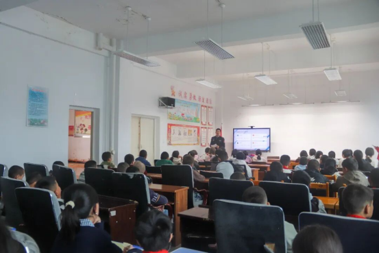 图为:民警西尔乃·买买提为华能·托河小学学生上法治安全教育课