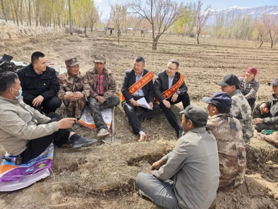 图为:退休干部深入田间基层,用通俗易懂的语言普及惠农政策