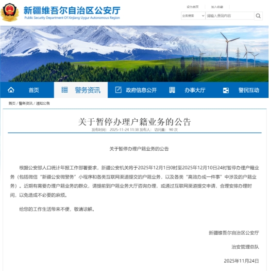 11月24日,据自治区公安厅网站消息,根据公安部人口统计年报工作部署要求,新疆公安机关将于2025年12月1日0时至2025年12月10日24时暂停办理户籍业务(包括微信“新疆公安微警务”小程序和各类互联网渠道提交的户籍业务,以及各类“高效办成一件事”中涉及的户籍业务)。