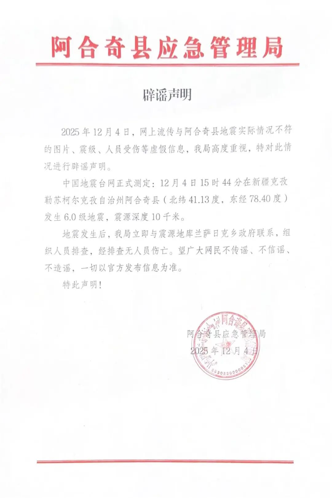 2025年12月4日15时44分,新疆克孜勒苏柯尔克孜自治州阿合奇县发生6.0级地震,震源深度10千米。目前,无人员伤亡,通信网络、水电暖、交通及群众生产生活秩序正常。