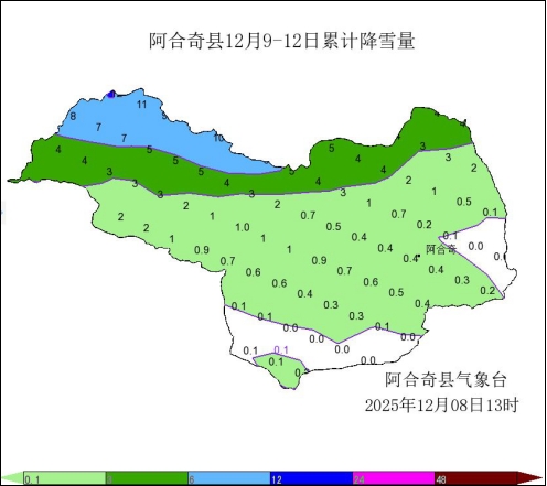 附图:阿合奇县2025年12月9-12日累积降雪量预报图(单位:毫米)
