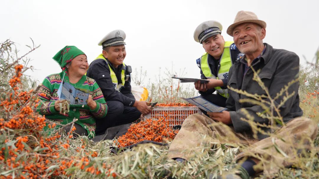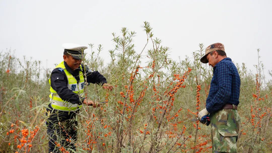 “大爷,您这沙棘长得真好,采收时可别忘了,拉运果实的三轮车可不能载人,咱安全第一!”在沙棘种植基地,民警们身着反光背心,一边接过农户手中的采收工具,熟练地协助采摘、搬运沙棘果实,一边与农户们拉起家常。面对农户们忙碌的身影,民警们分工协作,有的踮脚采摘枝头的沙棘果,有的弯腰捡拾掉落的果实,有的则合力将装满沙棘的筐篓搬运到运输车上,汗水浸湿了警服却丝毫没有影响干劲,田间地头呈现出一派警民同心助秋收的热闹景象。