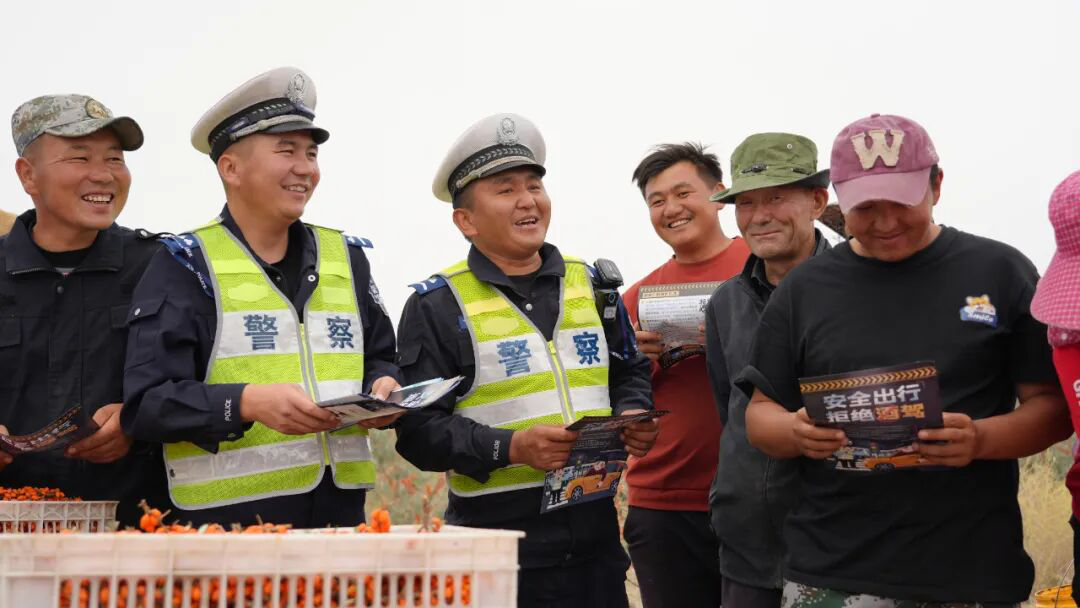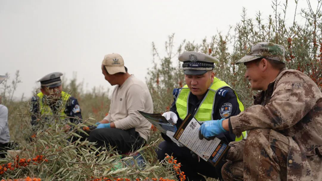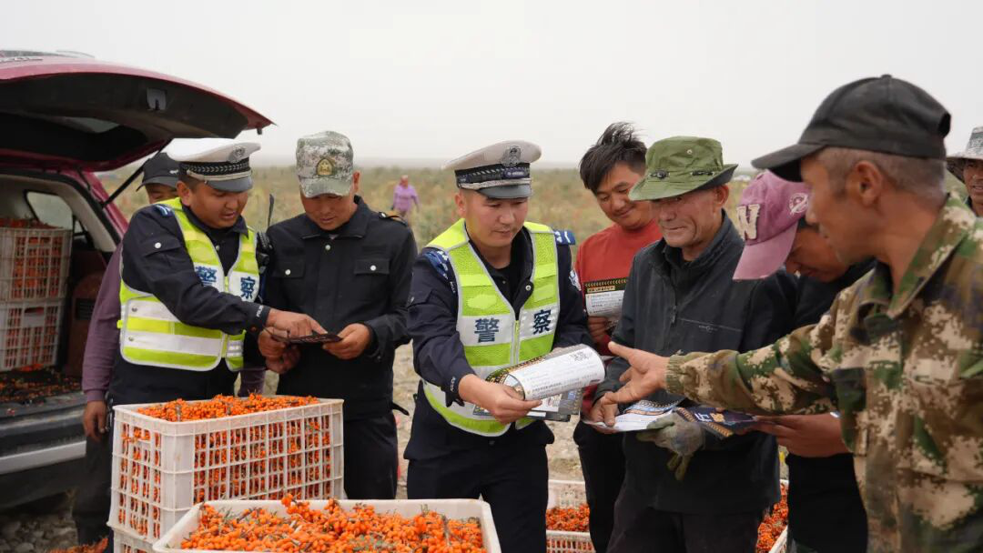 金秋时节,沙棘林里硕果累累,正是采收的关键时期。为切实保障秋收期间农村道路交通安全。近日,阿合奇县公安局交警大队结合辖区实际,组织民警深入田间地头,开展“助农秋收+交通安全”宣传活动,在帮助群众抢收沙棘的同时,把安全知识送到群众心坎上。