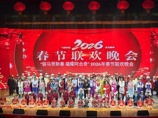 2月9日晚,阿合奇县新时代文明实践中心流光溢彩、暖意满堂,一场以“骏马贺新春福耀阿合奇”为主题的春节联欢晚会在这里热烈举行。县四套班子领导与各界群众欢聚一堂,共赏文艺精品,共话家乡发展,在欢声笑语中迎接充满希望的甲午马年。