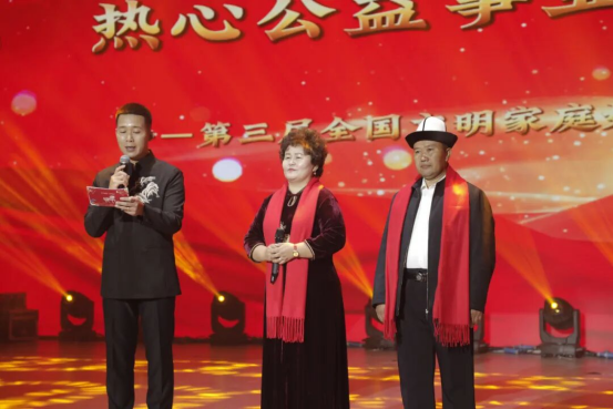 图为:全国文明家庭代表古丽巴依拉·肉孜阿力送新春祝福