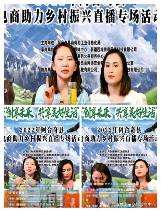 通过县域5名网红的共同努力下完成哈拉奇乡刺绣产品直播带货20余万元:色乡喀拉布隆村土豆直播带货2.7吨、杏子直播0.5吨。县域羊肉直播带货0.2吨。沙棘系列饮料直播带货8730元的好成绩。