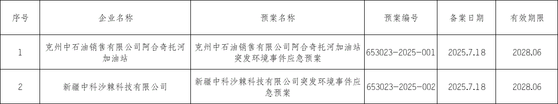 阿合奇县2025年第三季度突发环境事件应急预案备案情况