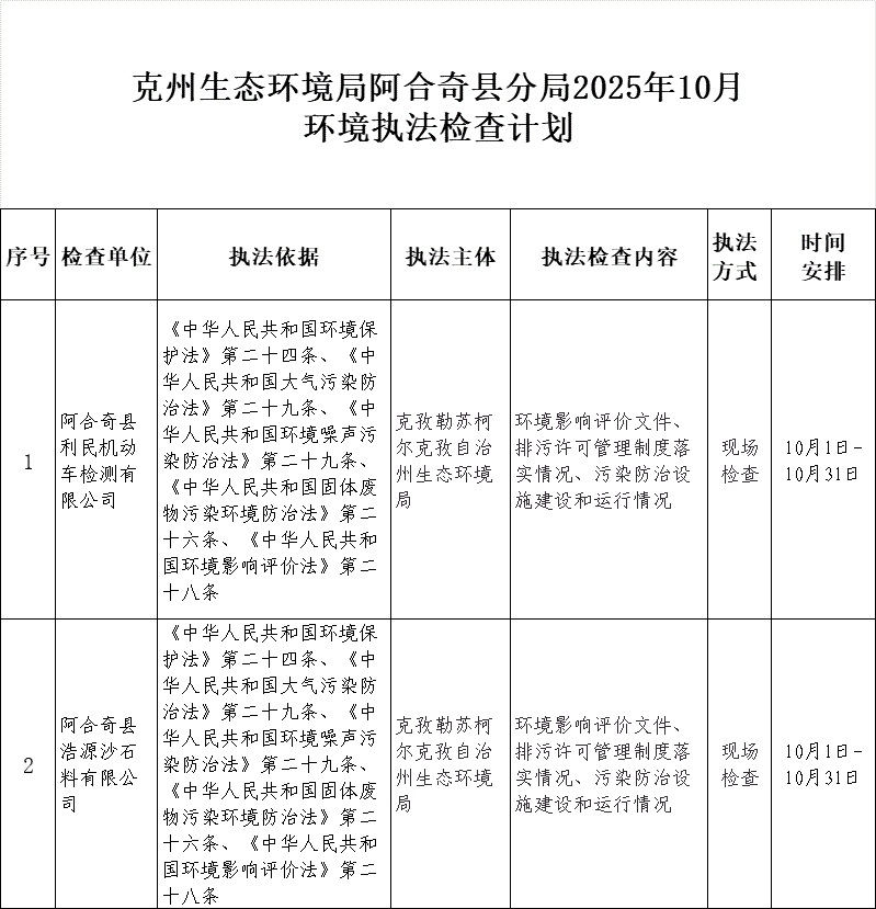克州生态环境局阿合奇县分局2025年10月环境执法检查计划