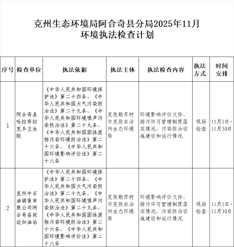 克州生态环境局阿合奇县分局2025年11月环境执法检查计划