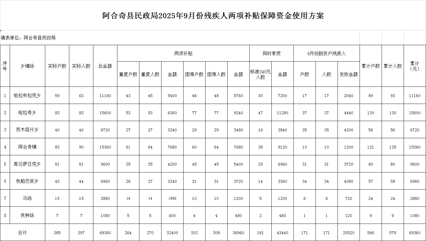 阿合奇县民政局2025年7-9月份残疾人两项补贴保障资金使用结果