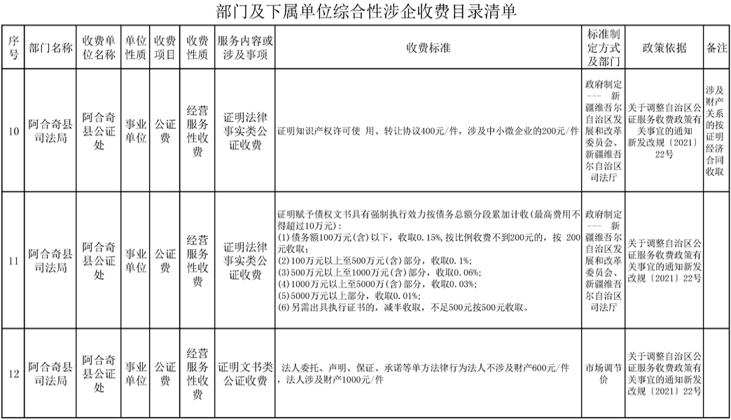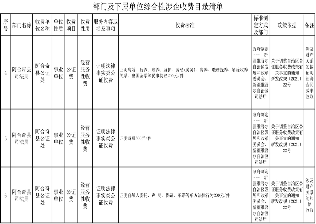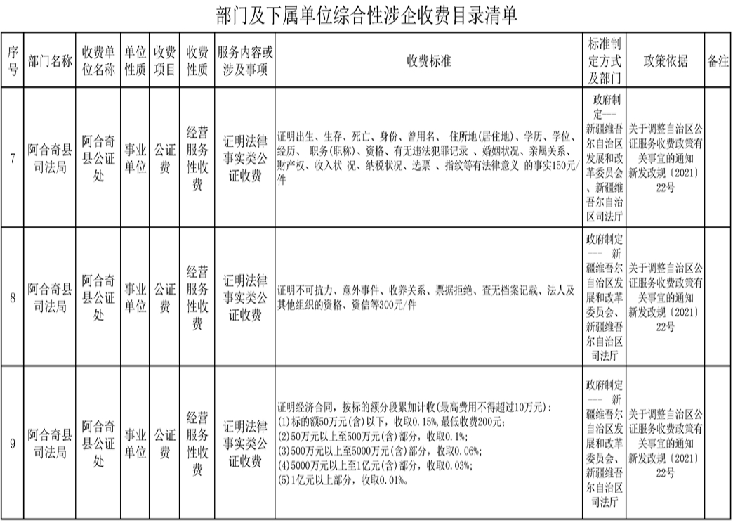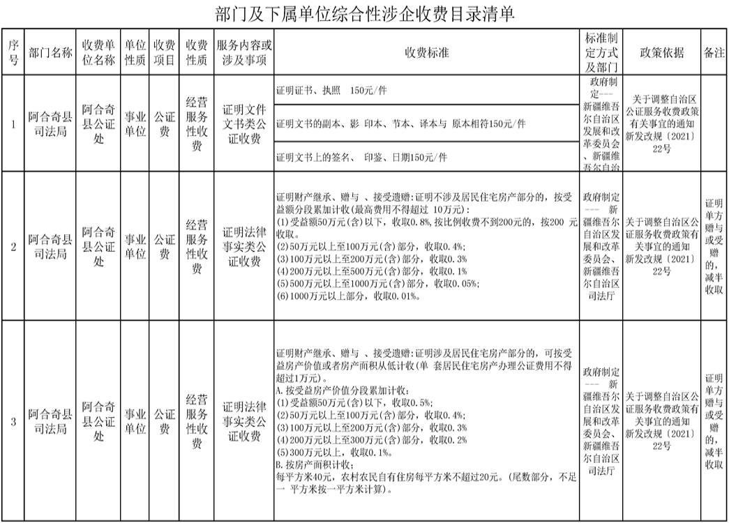 阿合奇县公证处综合性涉企收费目录清单
