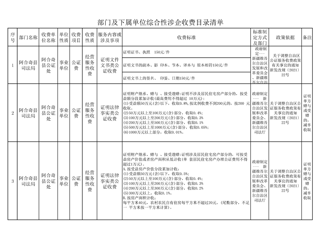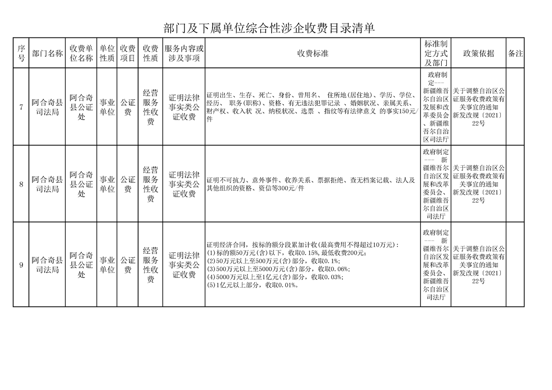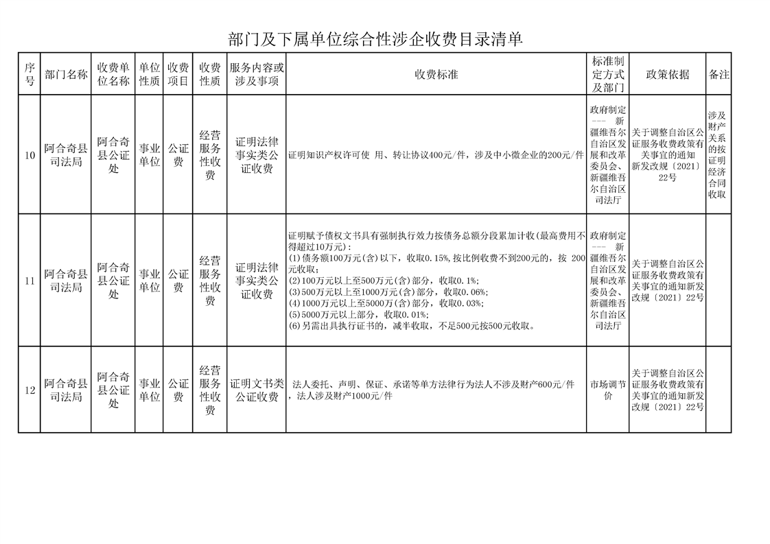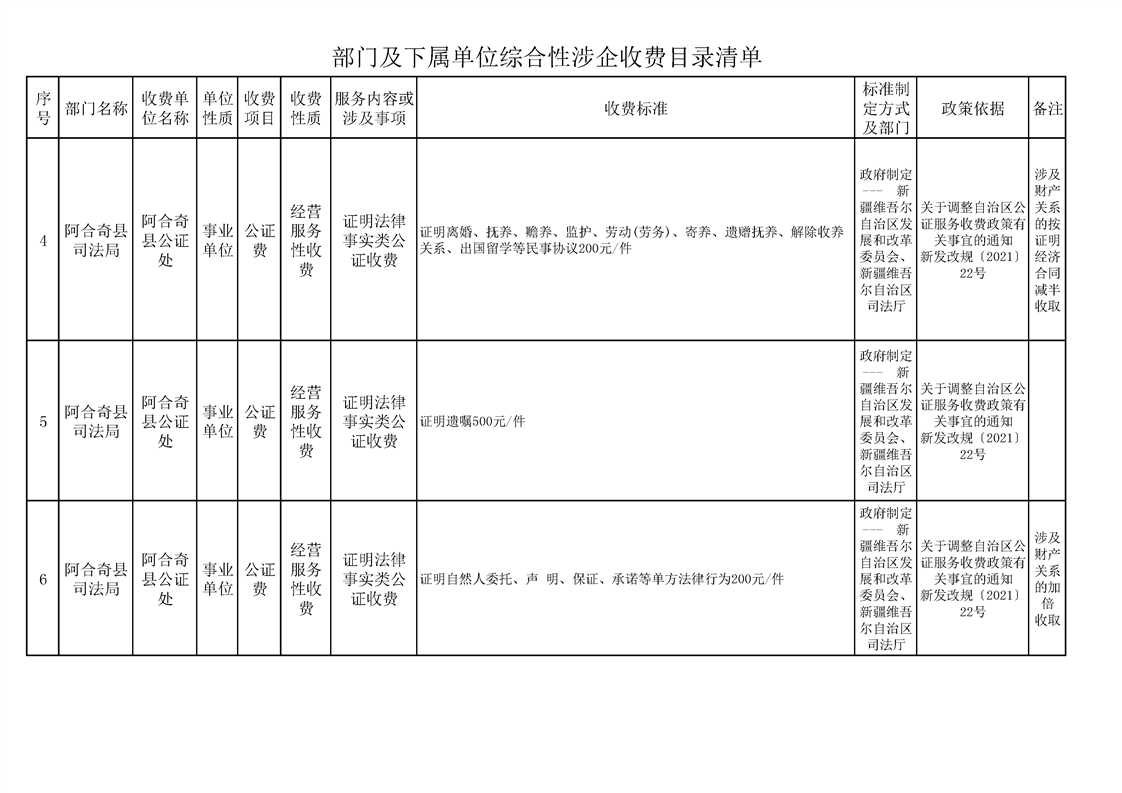 阿合奇县公证处综合性涉企收费目录清单