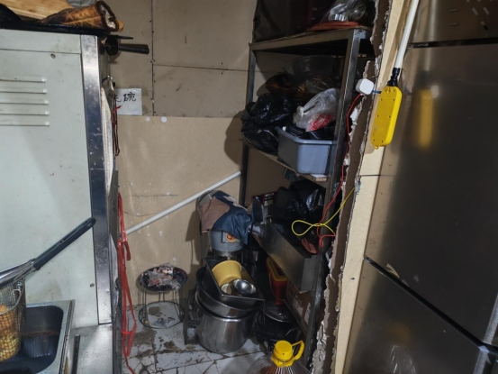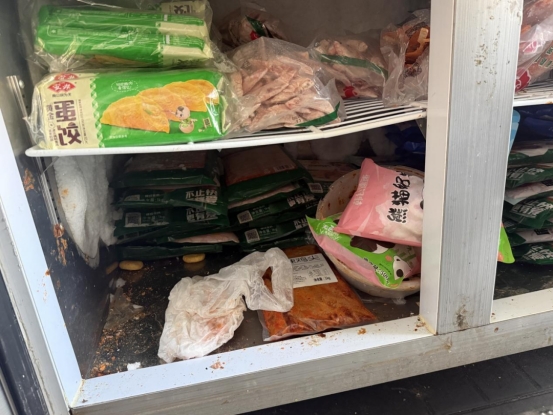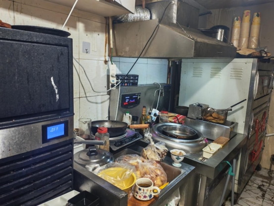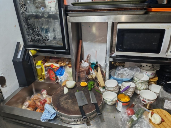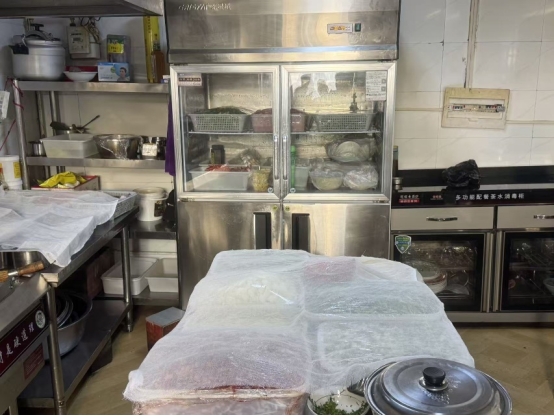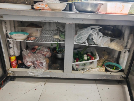 上榜理由:从业人员未着装;后厨环境卫生脏乱差,油污堆积;后厨加工区域物品摆放混乱;消毒柜卫生打扫不彻底未通电;冰箱积霜严重,食品原料杂乱堆放;操作间垃圾桶未放脚踩式垃圾桶;操作间窗户未安装纱窗;切菜切肉板存在混用,并发霉;餐饮工具未落实色标管理。