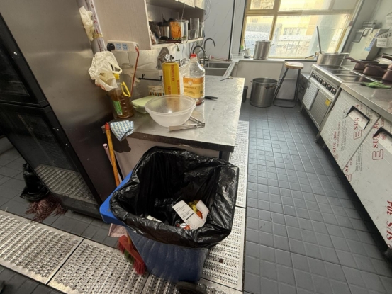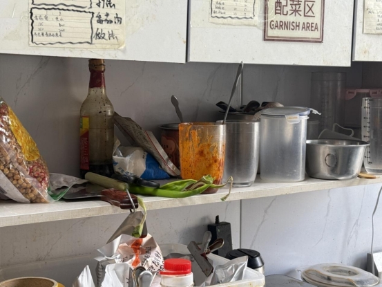 上榜理由:食品经营许可证过期;从业人员未办理健康证上岗,操作时未穿戴工作服、工作帽;后厨加工区域物品摆放混乱;消毒柜卫生打扫不彻底未通电;冰箱成品、半成品,食品原料杂乱堆放;后厨垃圾桶未加盖;冷冻设施内食品存放混乱,未及时清理干净;餐饮具及容器未色标管理使用,存在混用情况。
