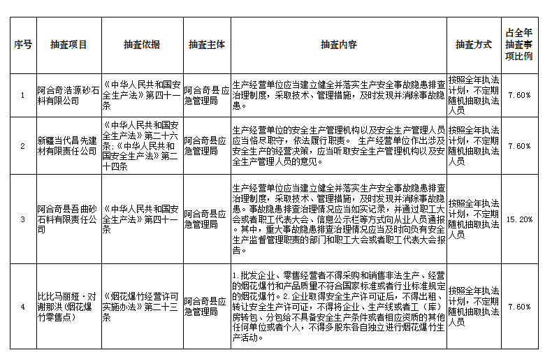 阿合奇县应急管理局2025年“双随机、一公开”随机抽查事项清单