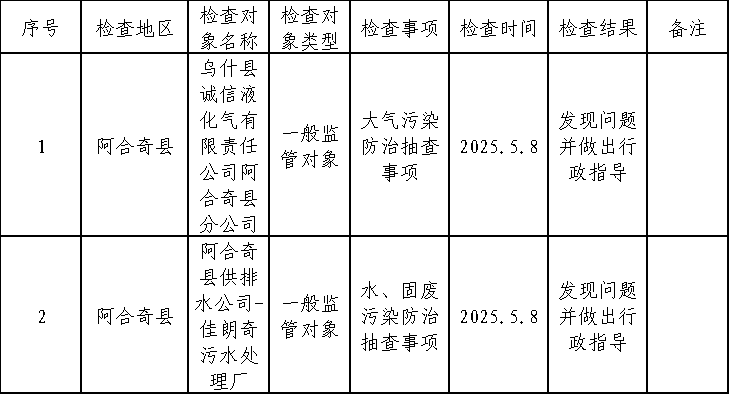 2025年5月份克州生态环境局阿合奇县分局生态环境执法“双随机、一公开”抽查结果信息公开表