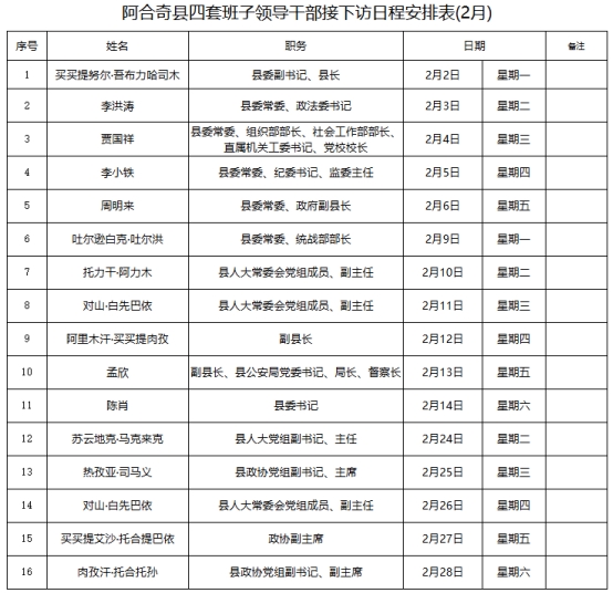 备注:1.接访场所:阿合奇县社会治安综合治理中心一楼。2.接访时间:工作日上午10:00-12:00,下午16:00-18:00。3.来访须知:来访人员须携带本人身份证及反映问题的相关材料,材料应当实事求是地反映问题,不得捏造事实,伪造证据,同案件涉及多个当事人的,须推选2至3名代表进入接访室反映问题。4.联系电话:0908-5623529。