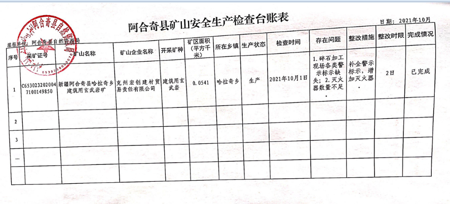 阿合奇县矿山安全生产检查台账