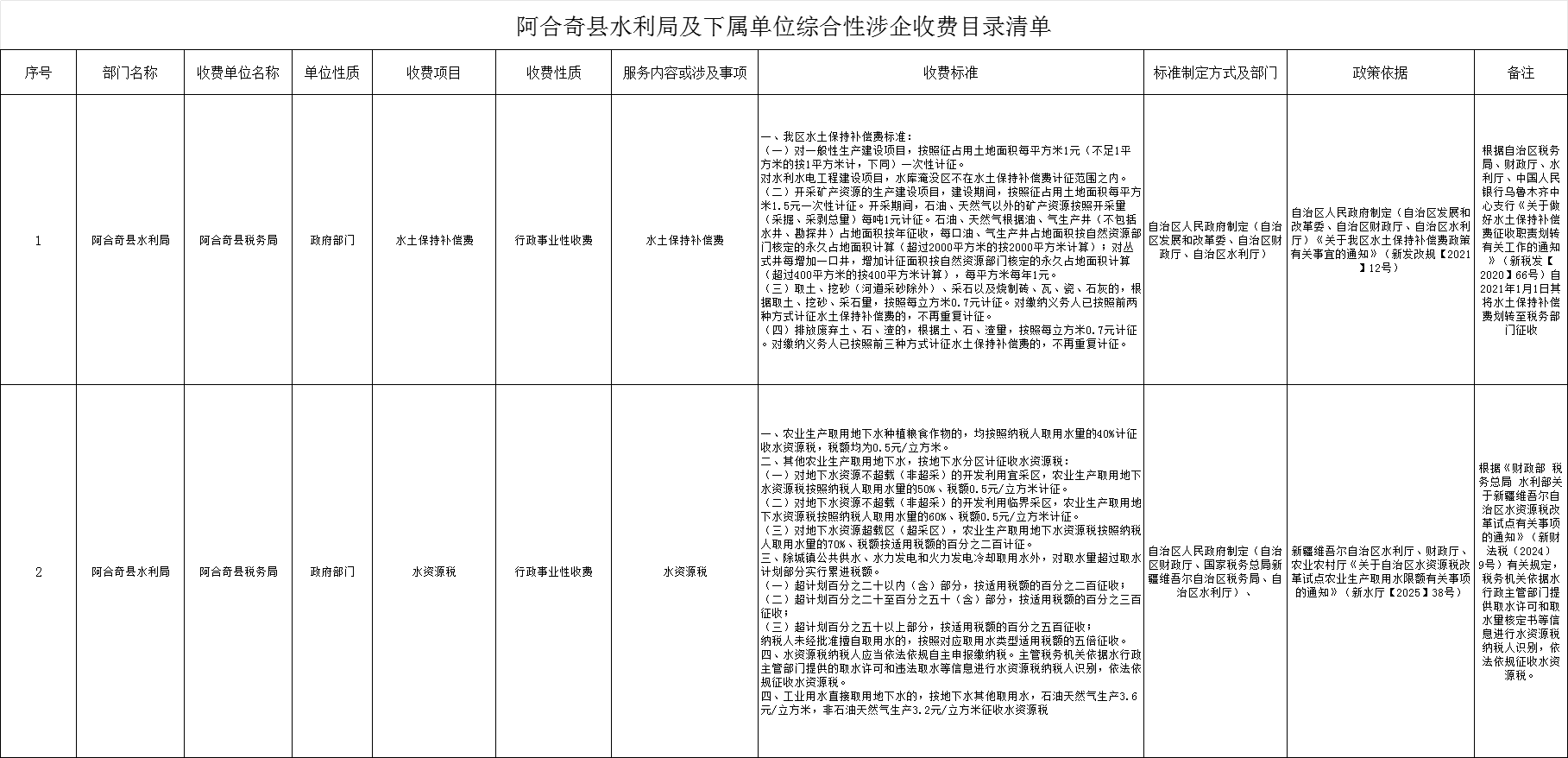 阿合奇县水利局及下属单位综合性涉企收费目录清单