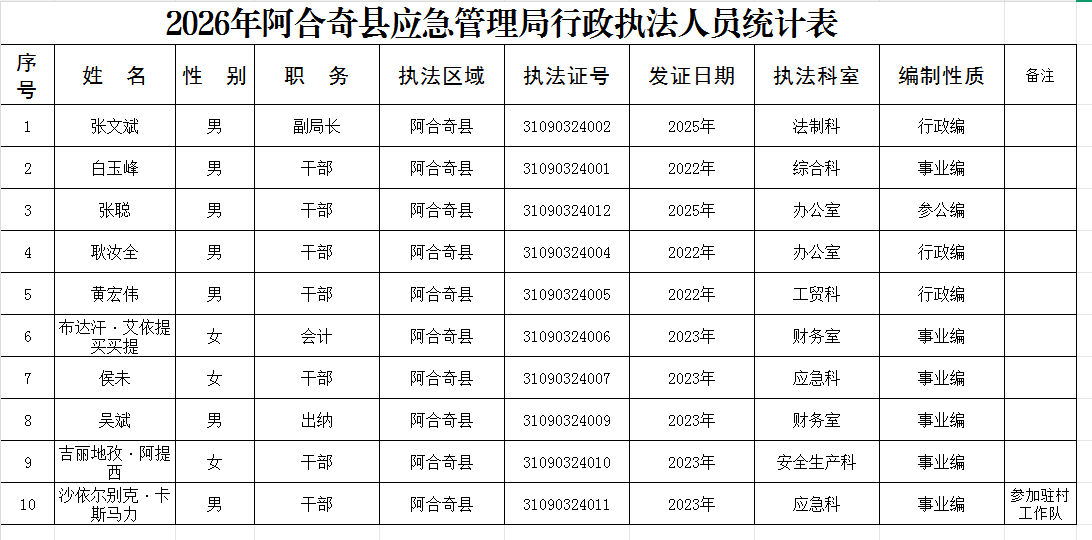 阿合奇县应急管理局2026年执法人员名录