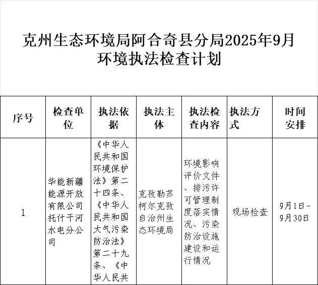 克州生态环境局阿合奇县分局2025年9月环境执法检查计划