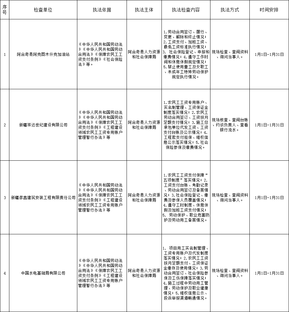 阿合奇县人力资源和社会保障局2026年1月劳动监察执法检查计划