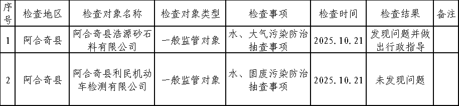 2025年10月份克州生态环境局阿合奇县分局生态环境执法“双随机、一公开”抽查结果信息公开表
