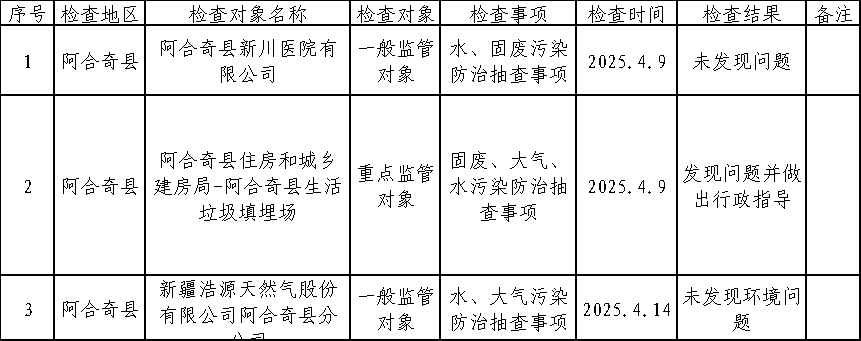 2025年4月份克州生态环境局阿合奇县分局生态环境执法“双随机、一公开”抽查结果信息公开表