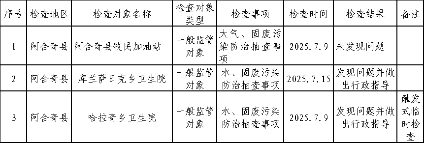 2025年7月份克州生态环境局阿合奇县分局生态环境执法“双随机、一公开”抽查结果信息公开表