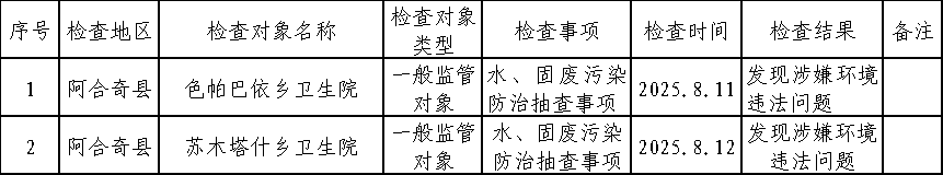 2025年8月份克州生态环境局阿合奇县分局生态环境执法“双随机、一公开”抽查结果信息公开表