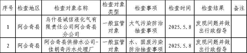 2025年5月份克州生态环境局阿合奇县分局生态环境执法“双随机、一公开”抽查结果信息公开表