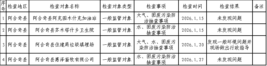 克州生态环境局2026年1月“双随机、一公开”检查结果信息公示